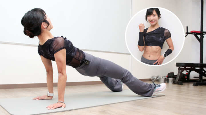 今回は、仰向けで行う「ハイリバースプランク」を解説。腹筋ともも裏にに特に効くメニューです。腕はしっかり伸ばして、腰が落ち…
