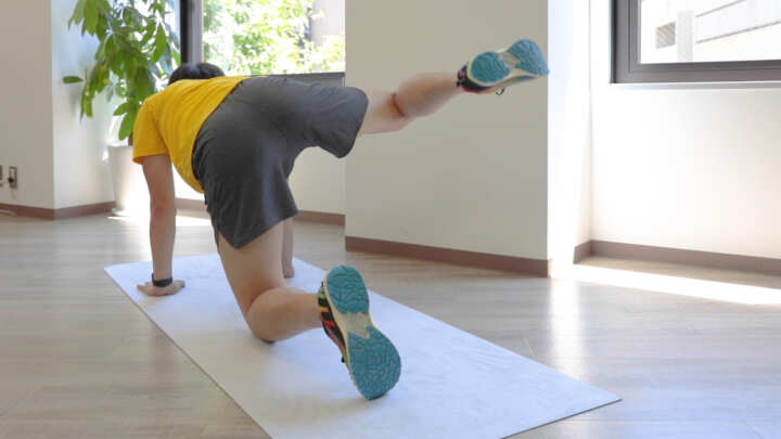 今回は、仰向けで行う「ハイリバースプランク」を解説。腹筋ともも裏にに特に効くメニューです。腕はしっかり伸ばして、腰が落ち…
