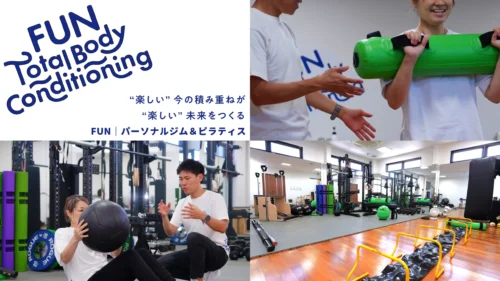 FUN|パーソナルジム&ピラティスはコンディショニング・トレーニング・栄養を軸に、身体づくりを継続しやすいプログラムを提供してくれるパーソナルジムです。ダイエット・ボディメイクで理想の体型を実現したり、スポーツや日常動作のパフォーマンスの向上や、肩こりや腰痛などのお悩みの解消まで、一人一人のなりたい身体にあわせてやトレーニングの目的にあわせて身体づくりをサポートしてくれます。清潔感あるスタジオで、トレーニングマシンやピラティスの機材も充実している環境の中、トレーニングに集中することができます。