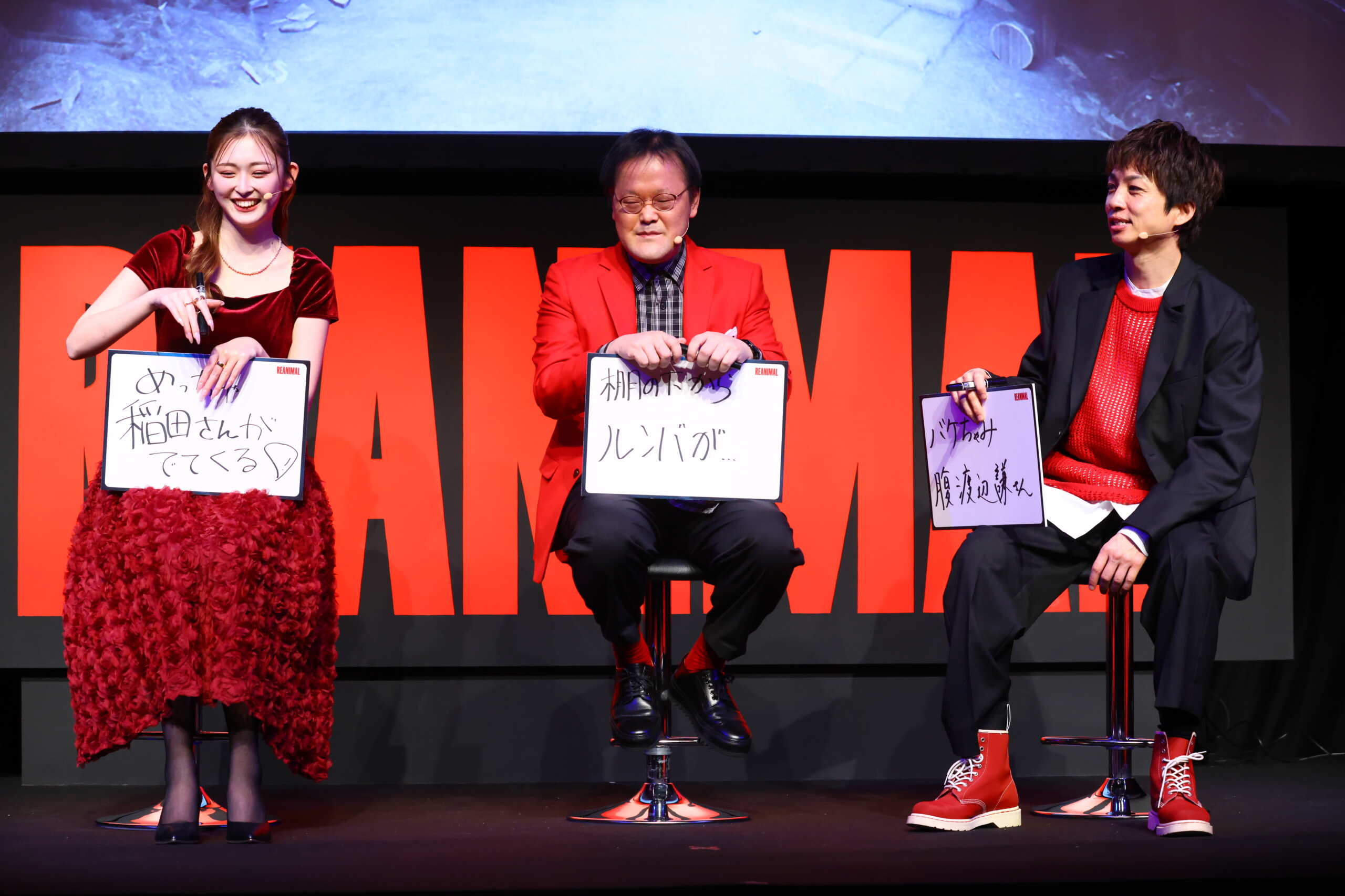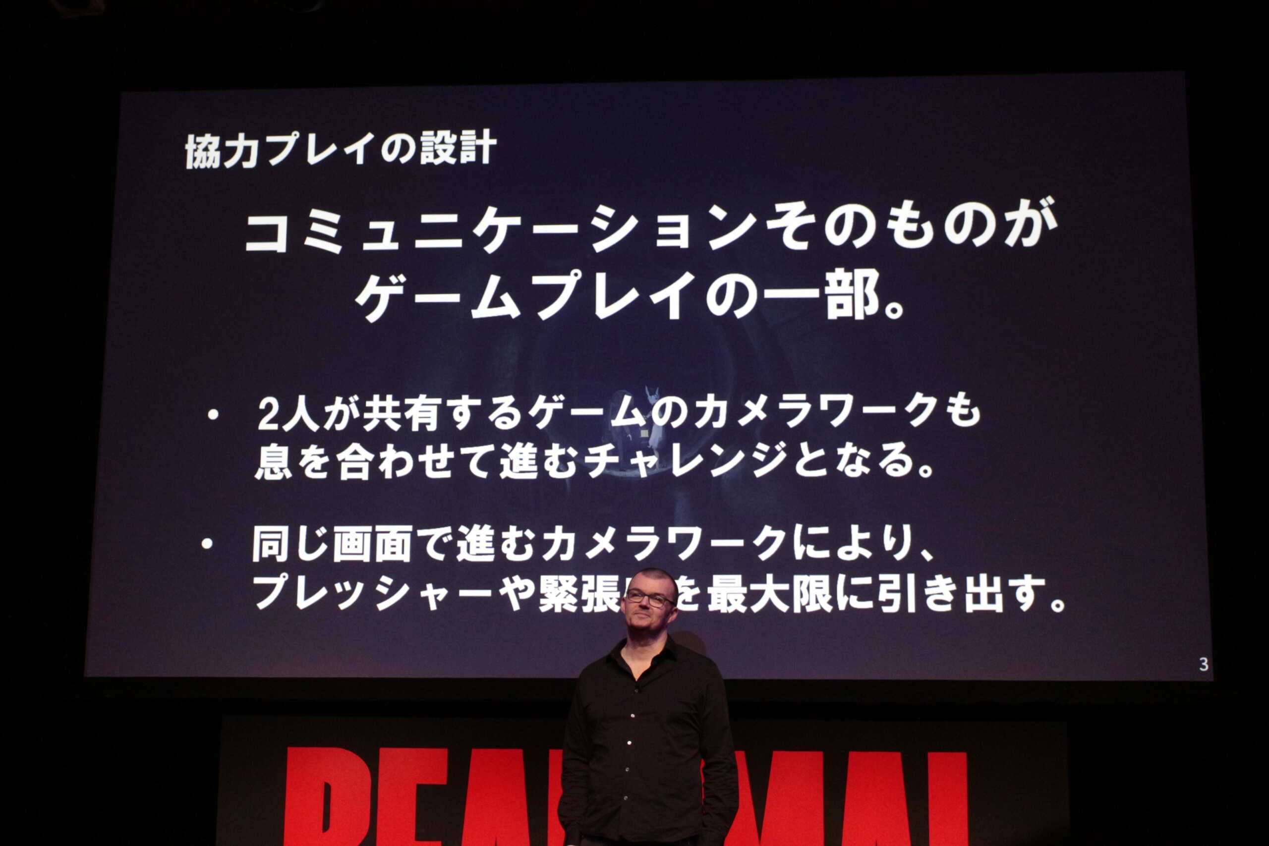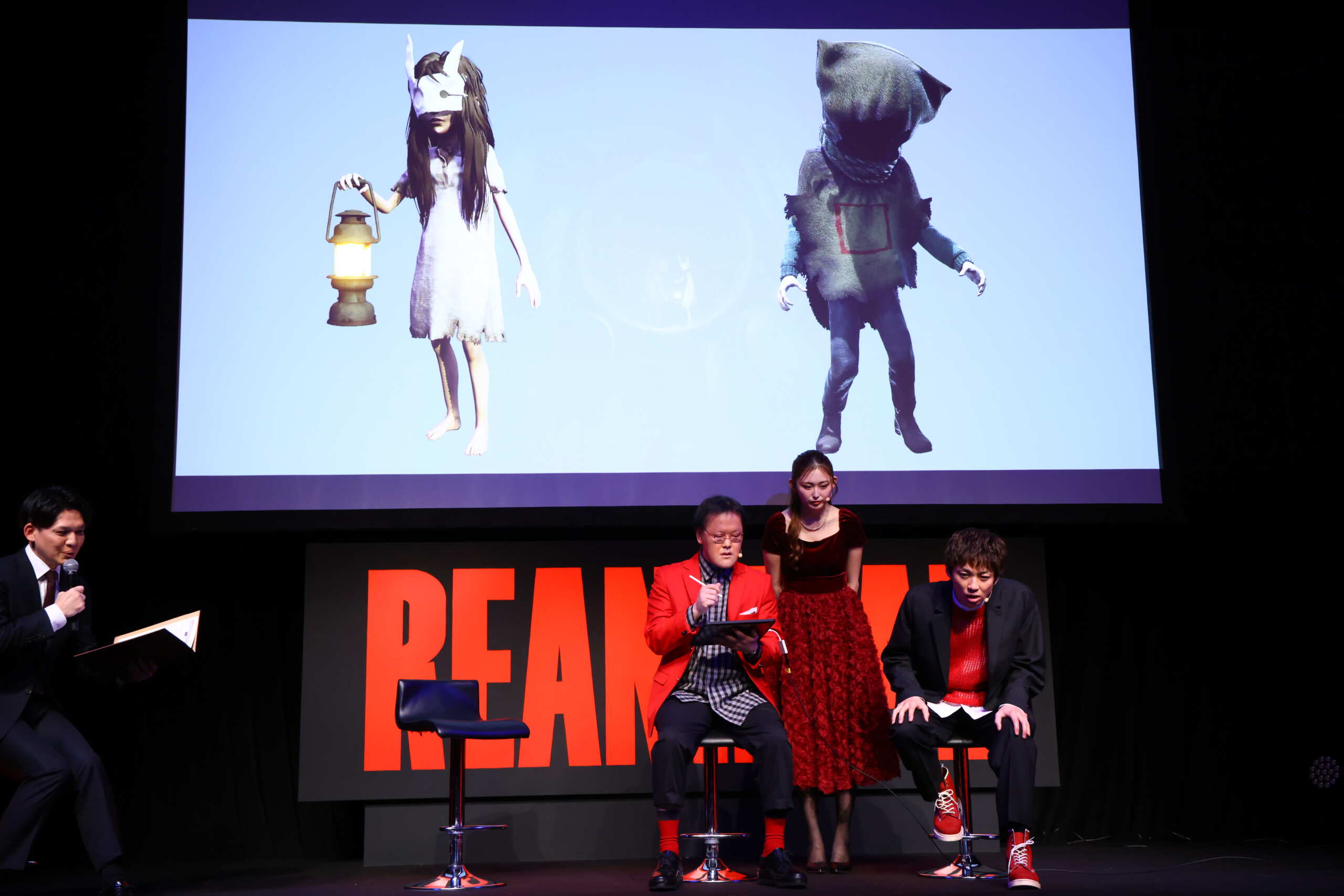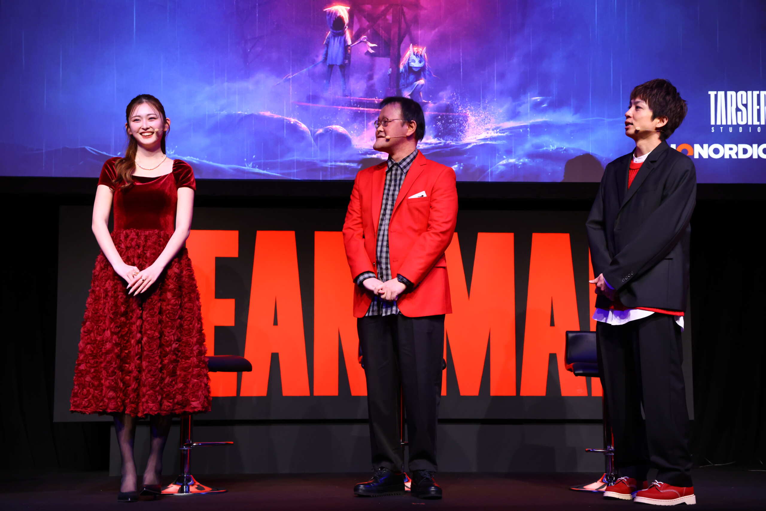 登壇したのは、開発元Tarsier Studiosのナラティブディレクター、David Mervik氏。そしてゲストにアインシュタイン(稲田直樹、河井ゆずる)と、ゆうちゃみ。会場は笑いと悲鳴が入り混じる独特の空気に包まれた。