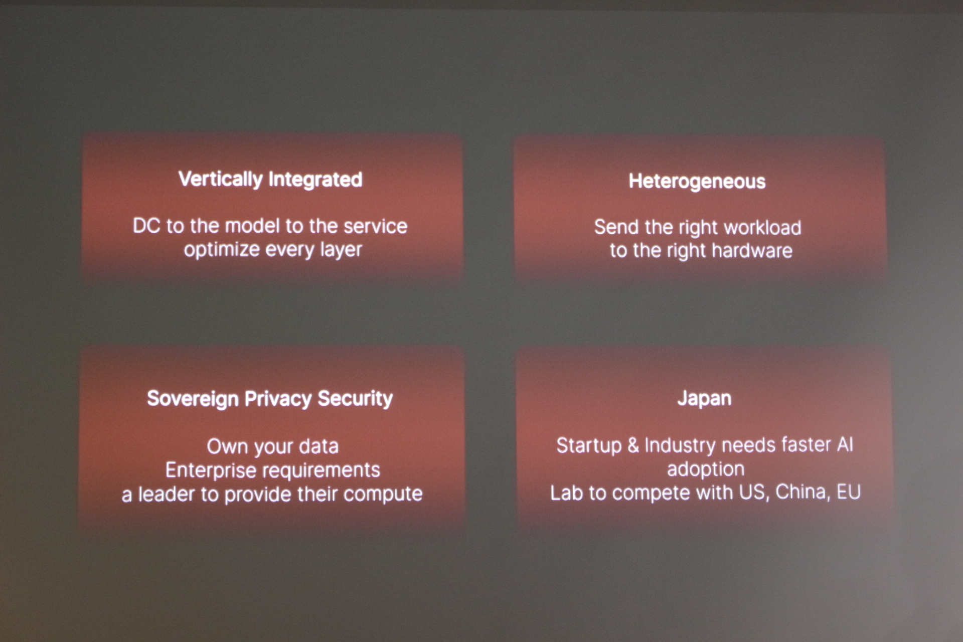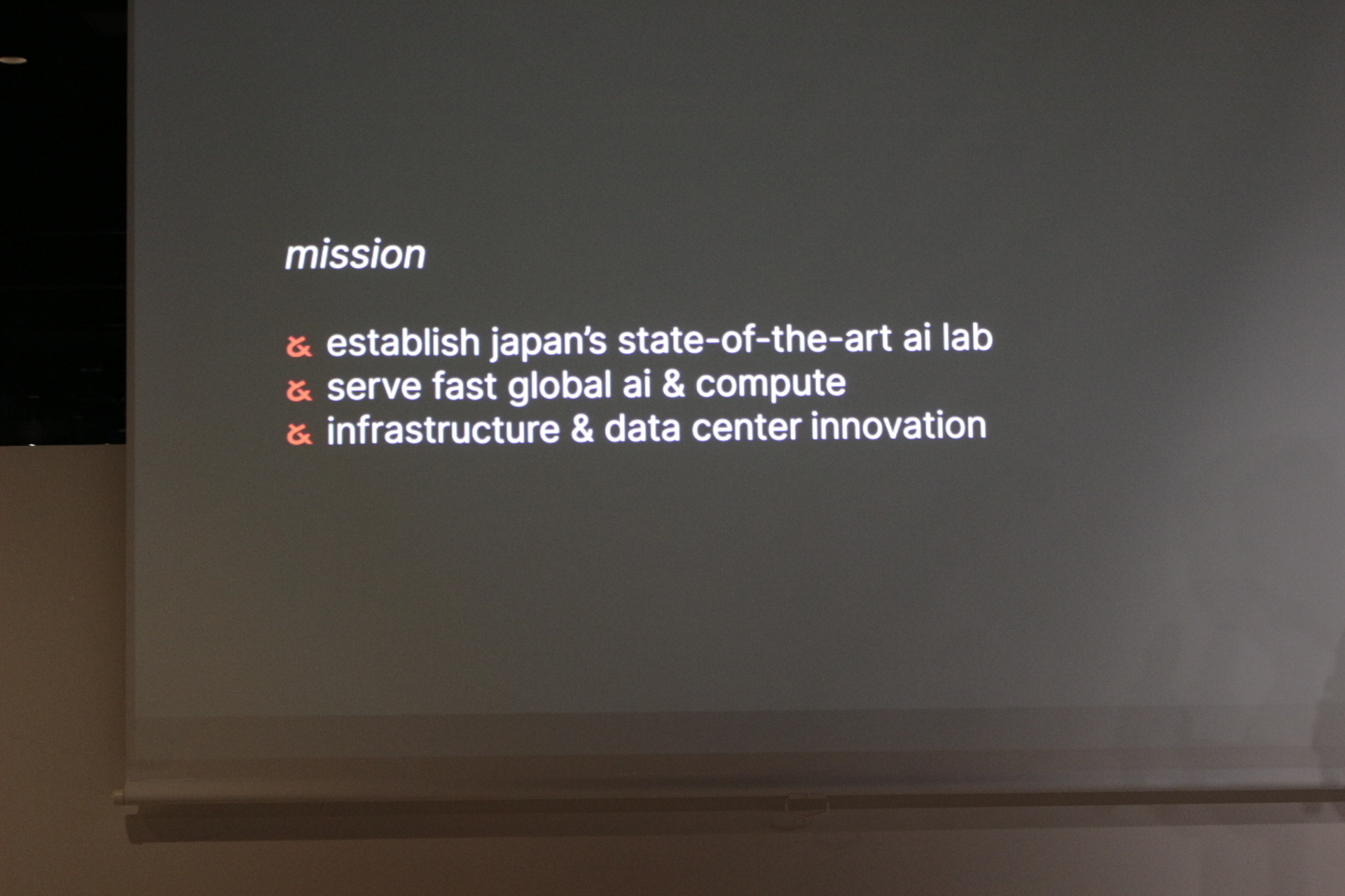 同社が掲げるミッションは大きく3つある。1つ目は、日本の最先端AIラボを構築すること。2つ目は、グローバル水準のAIとコンピュートを提供すること。3つ目は、インフラとデータセンター領域でのイノベーションを通じ、その提供価値を高めていくことだ。