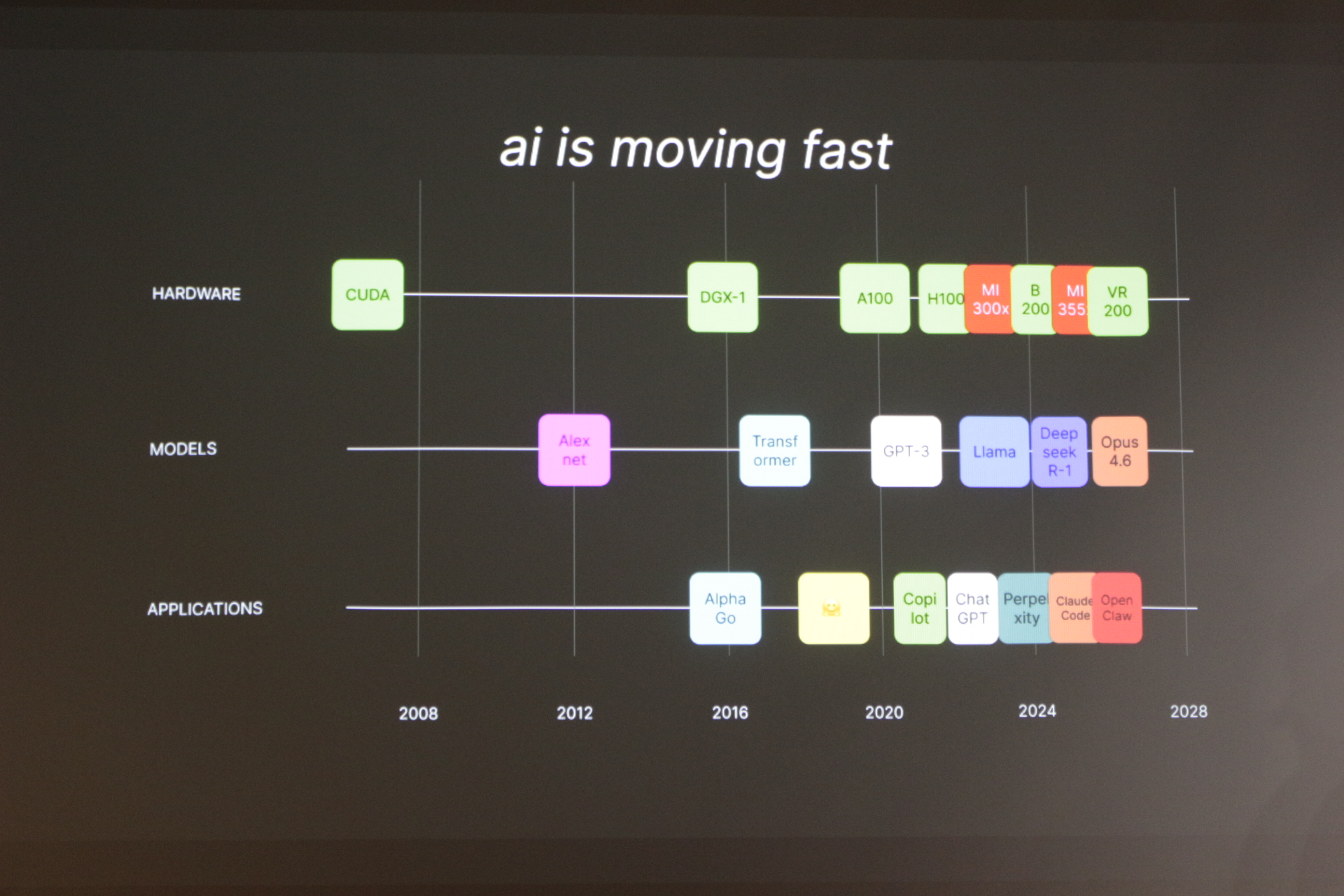 スライドでも、CUDA、DGX、GPT-3、ChatGPT、Claude Code、OpenClawといった技術の変遷が、加速するタイムラインとして示されていた。