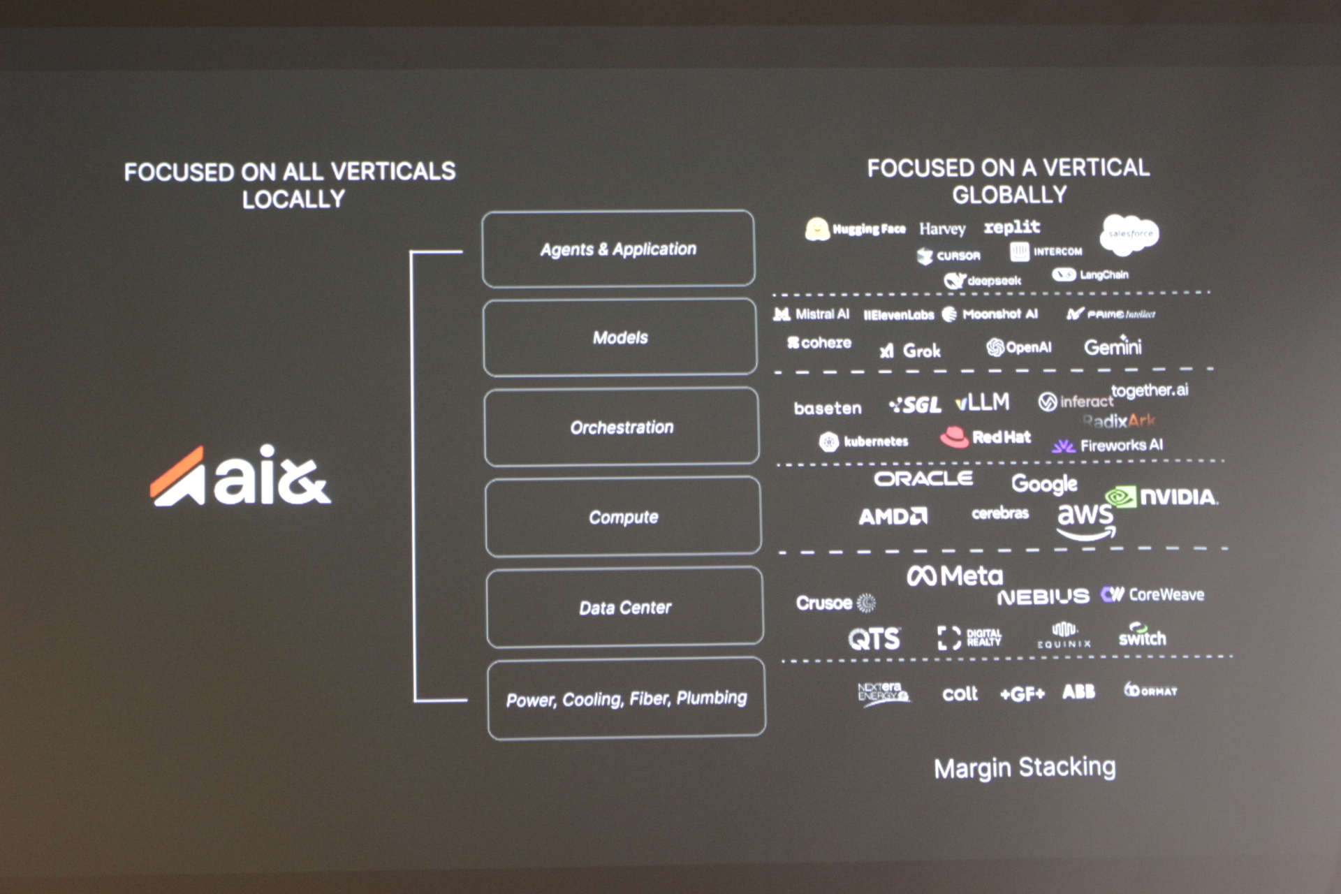 原氏は、現在の市場では電力事業者、データセンター事業者、コンピュート事業者、オーケストレーション、モデル、エージェントといった各層が別々に存在し、それぞれが利益を乗せることで、最終的にユーザーが高コストでAIを利用する構造になっていると指摘した。