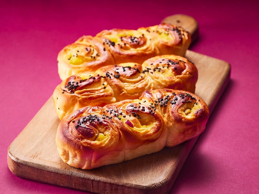 さつまいもクリームと角切りのさつまいもを練り込み、しっとりとしたやわらかい食感をお楽しみいただけます。