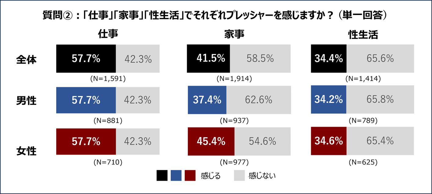 3人に1人が性生活のプレッシャーを「感じる」と回答していることになります。男女別だと男性34.2%、女性34.6%がプレッシャーを「感じる」と回答しました。