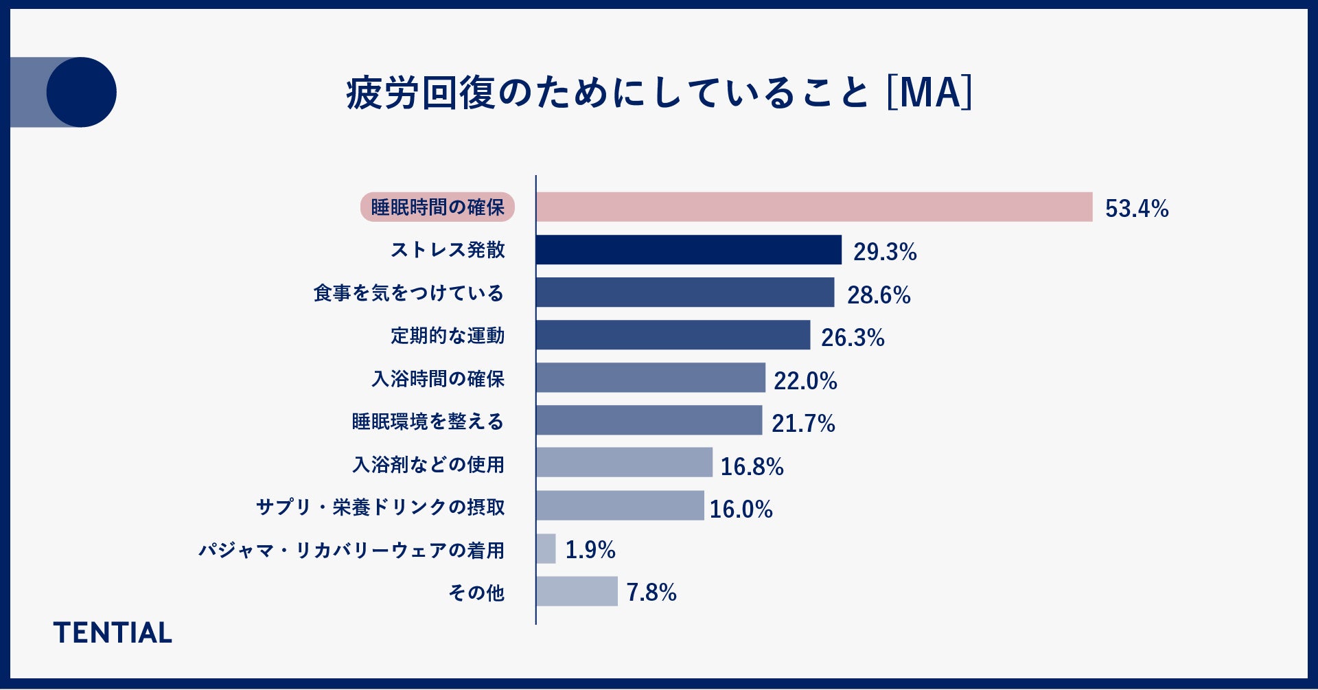 「疲労回復のためにしていること」のトップが睡眠時間の確保で、50%以上の方が回答しています。