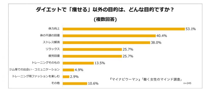 注目すべきは、約5割(51.8%)の女性がダイエットに「痩せる」以外の目的があると回答している点。どんな目的があるのか深堀りしてみると、「体力向上のため(53.1%)」「体の不調の回復のため(40.4%)」「ストレス解消のため(38.0%)」といった結果が上位に食い込んでいます。