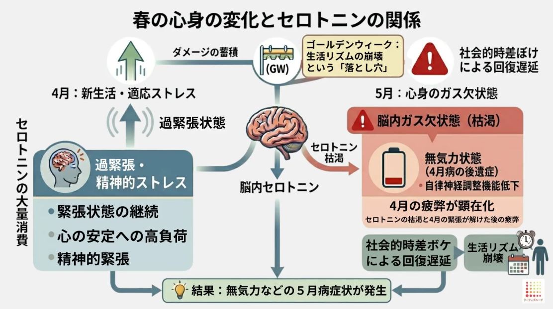 4月は新しい環境への適応が求められる時期であり、過度な緊張や環境変化に対応するため、心を安定させる脳内物質「セロトニン」が大量に消費されます。その結果、5月を迎える頃には、いわば「脳の貯金」が底をついたガス欠状態に陥るといいます。
