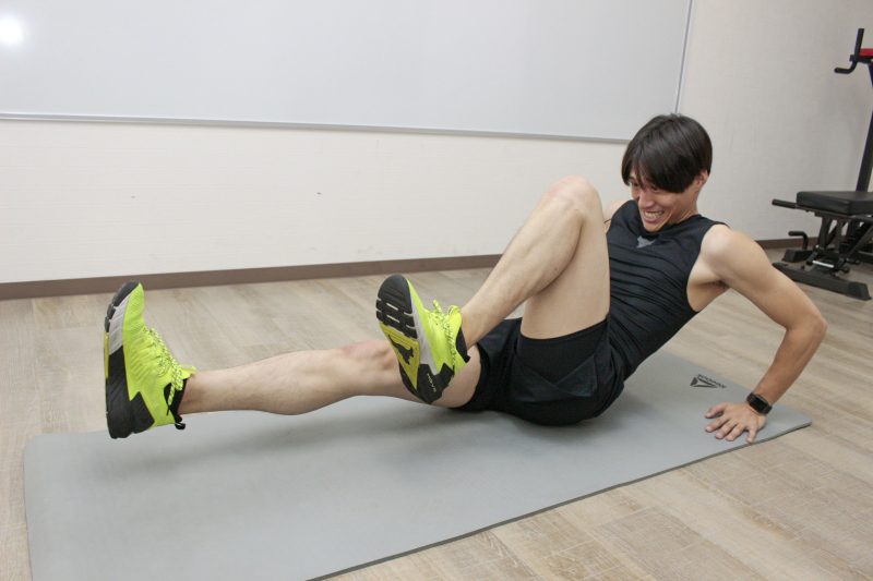 1.両手をお尻の横につき、両足を伸ばして浮かせる