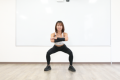 2. 背筋を伸ばし、地面と太ももが平行になるまで下げていく