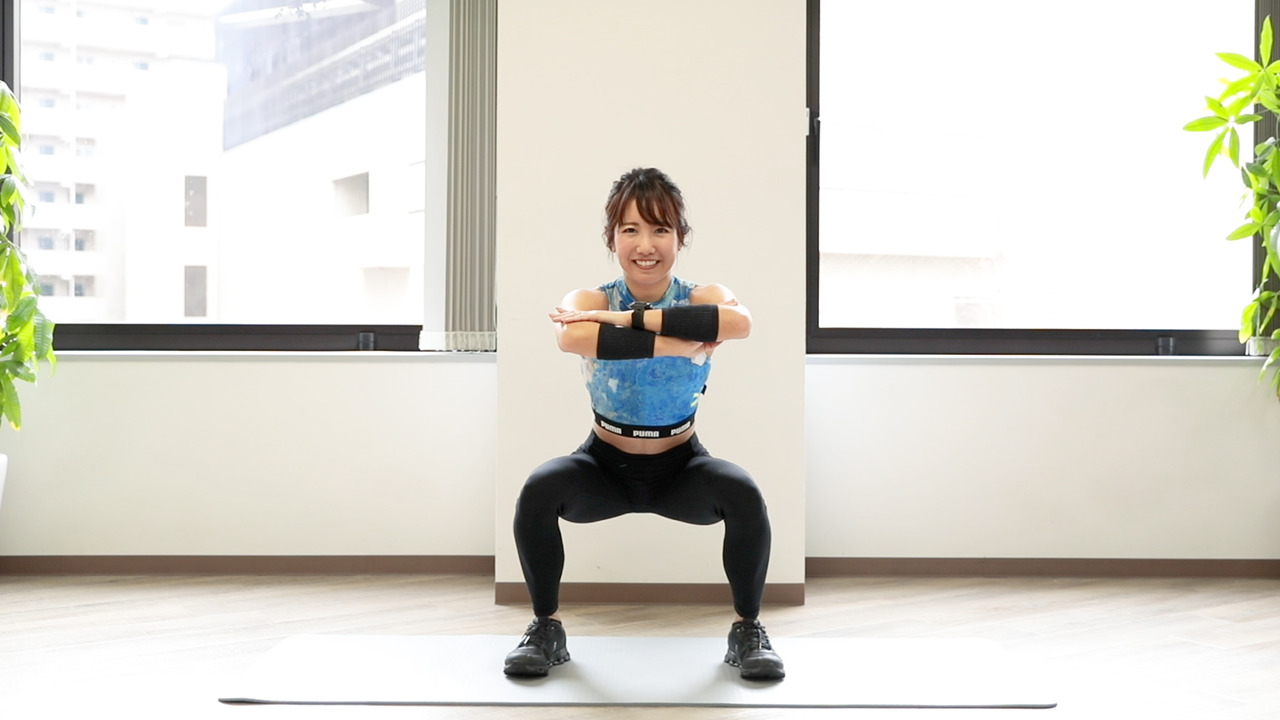 1.軽くジャンプしてからしゃがみ、足を伸ばす