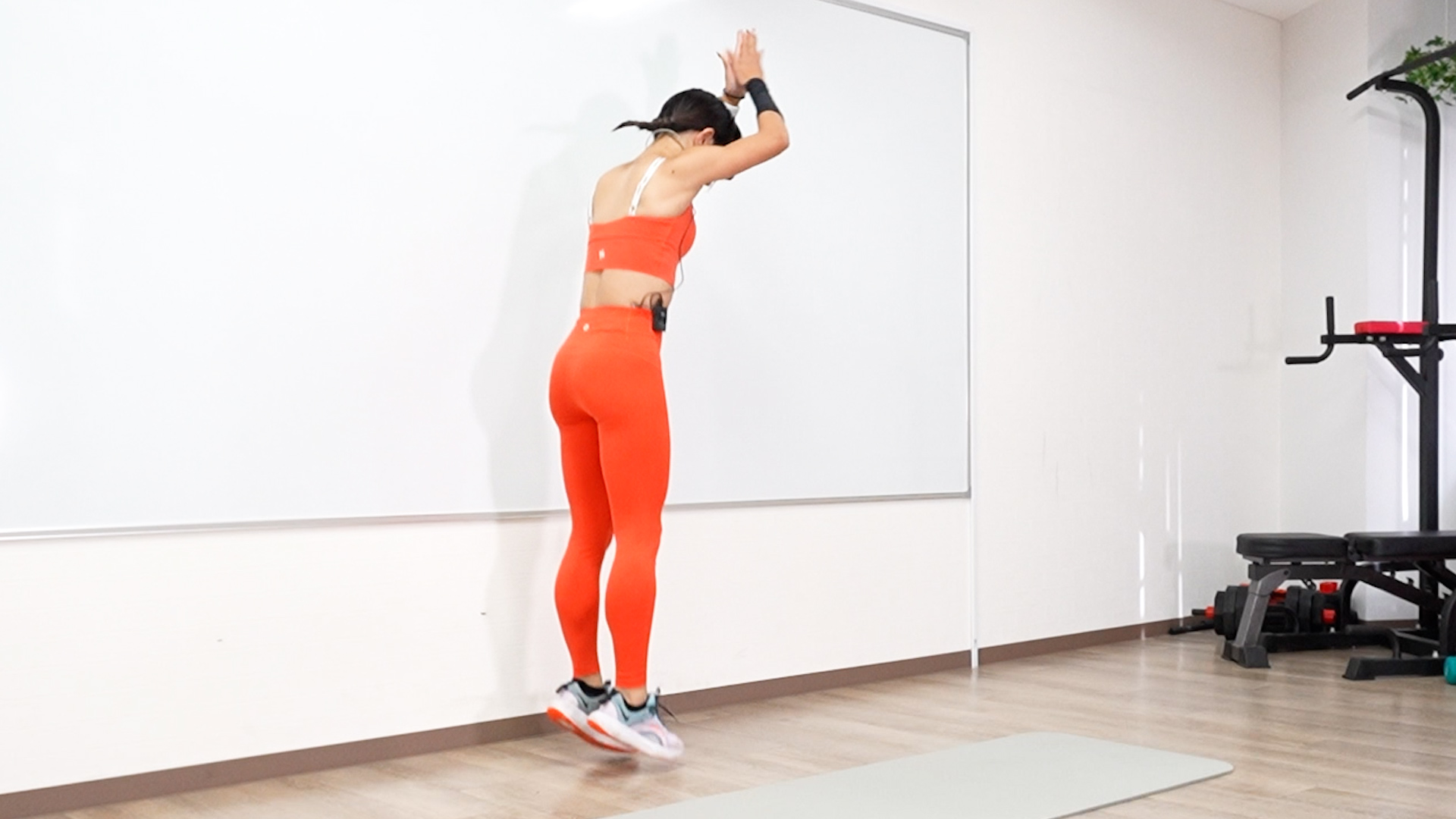 両膝を交互に引きつけて伸ばして戻した後、ジャンプしましょう。