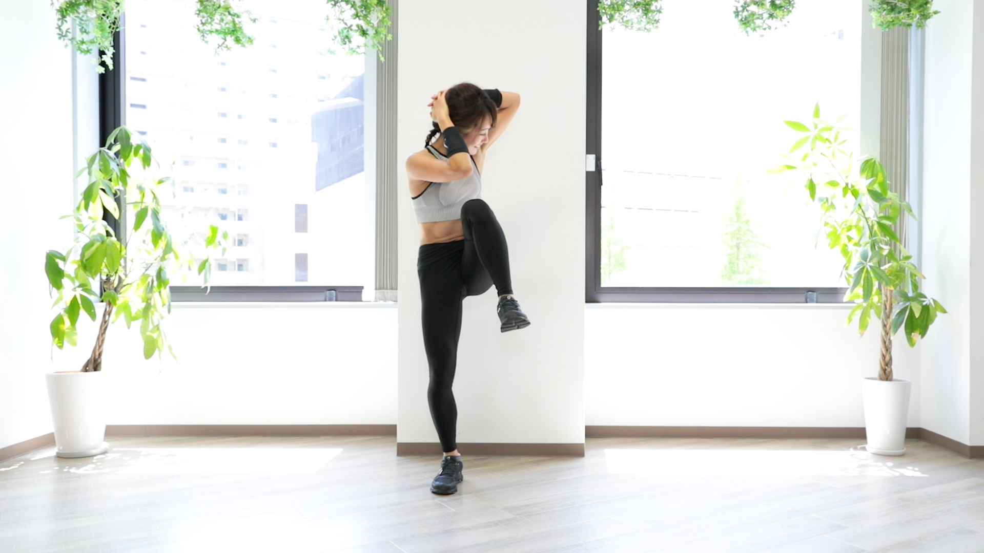 2.軽くジャンプをしながら右肘と左膝、左肘と右膝の組み合わせで、交互に引き付ける