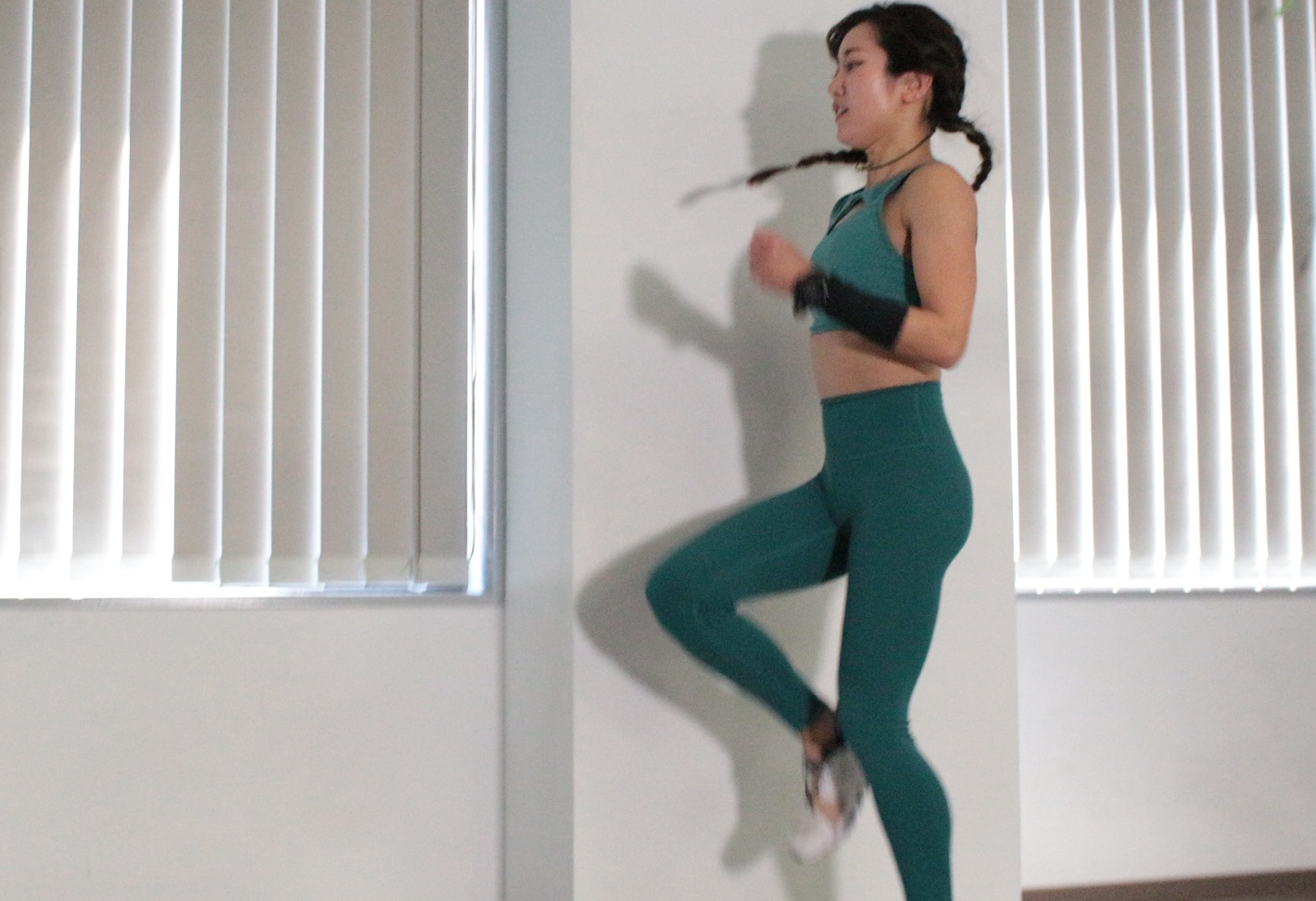 今度はペースを上げて、その場で軽く走ります。素早く動かさなくてOKです。