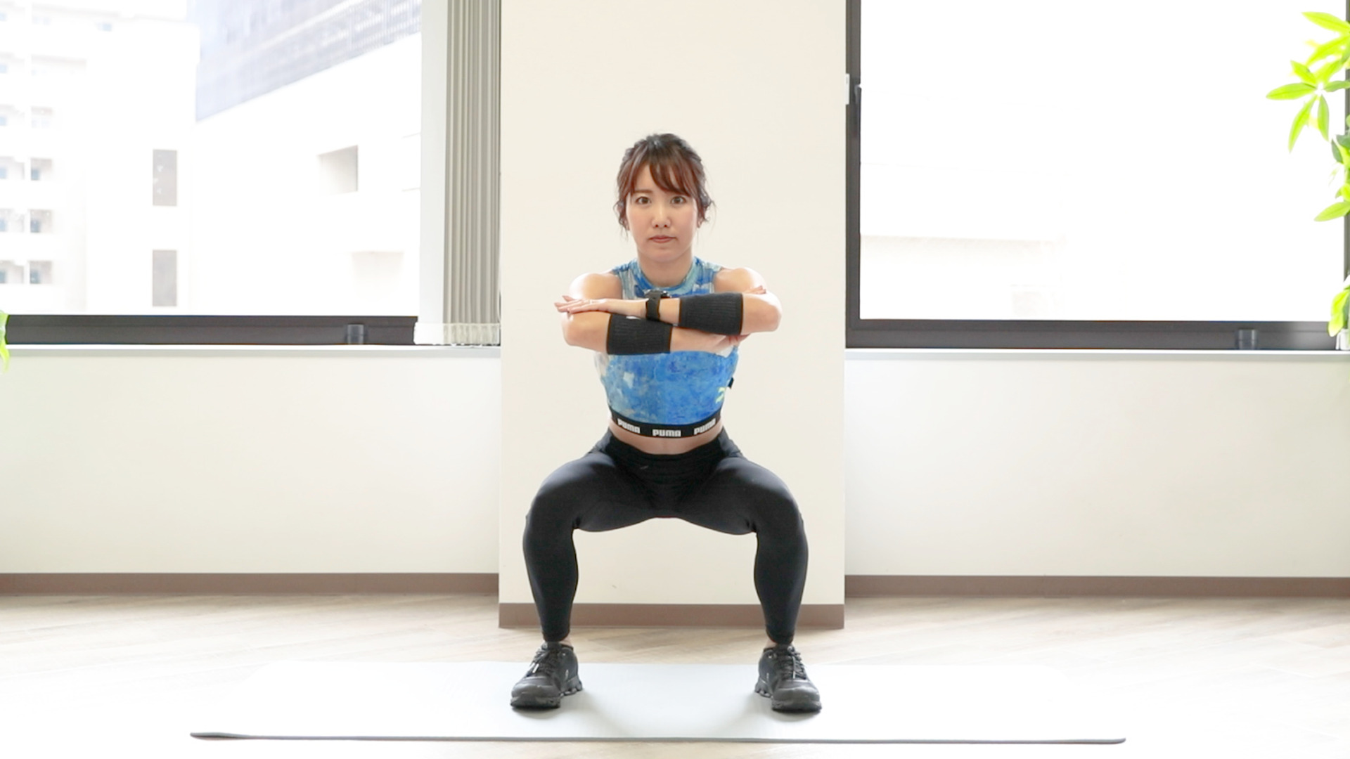 4.息を吐きながらゆっくり腰を上げ、膝が伸びきる手前でまた腰を落としていく