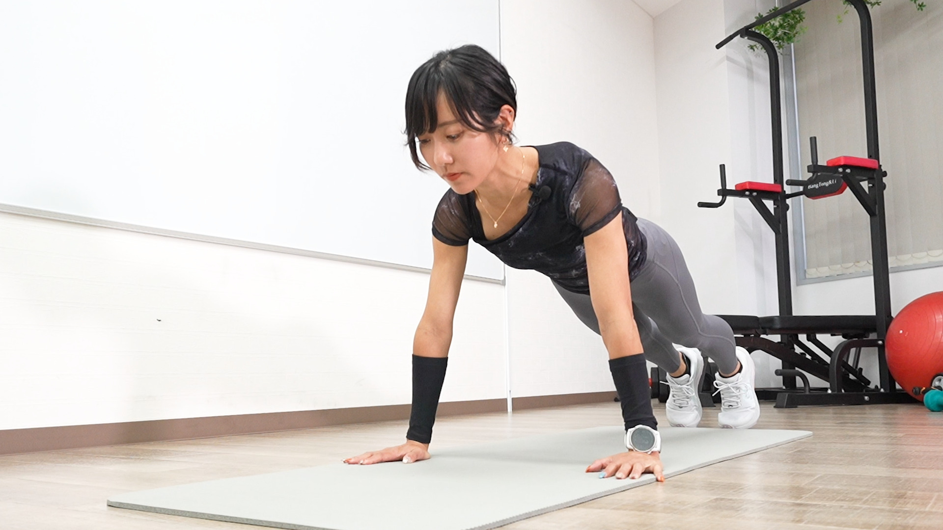 両手と両脚のつま先で体を支えた状態から、腕の曲げ伸ばしを行います。腰が落ちやすいので気をつけてください。