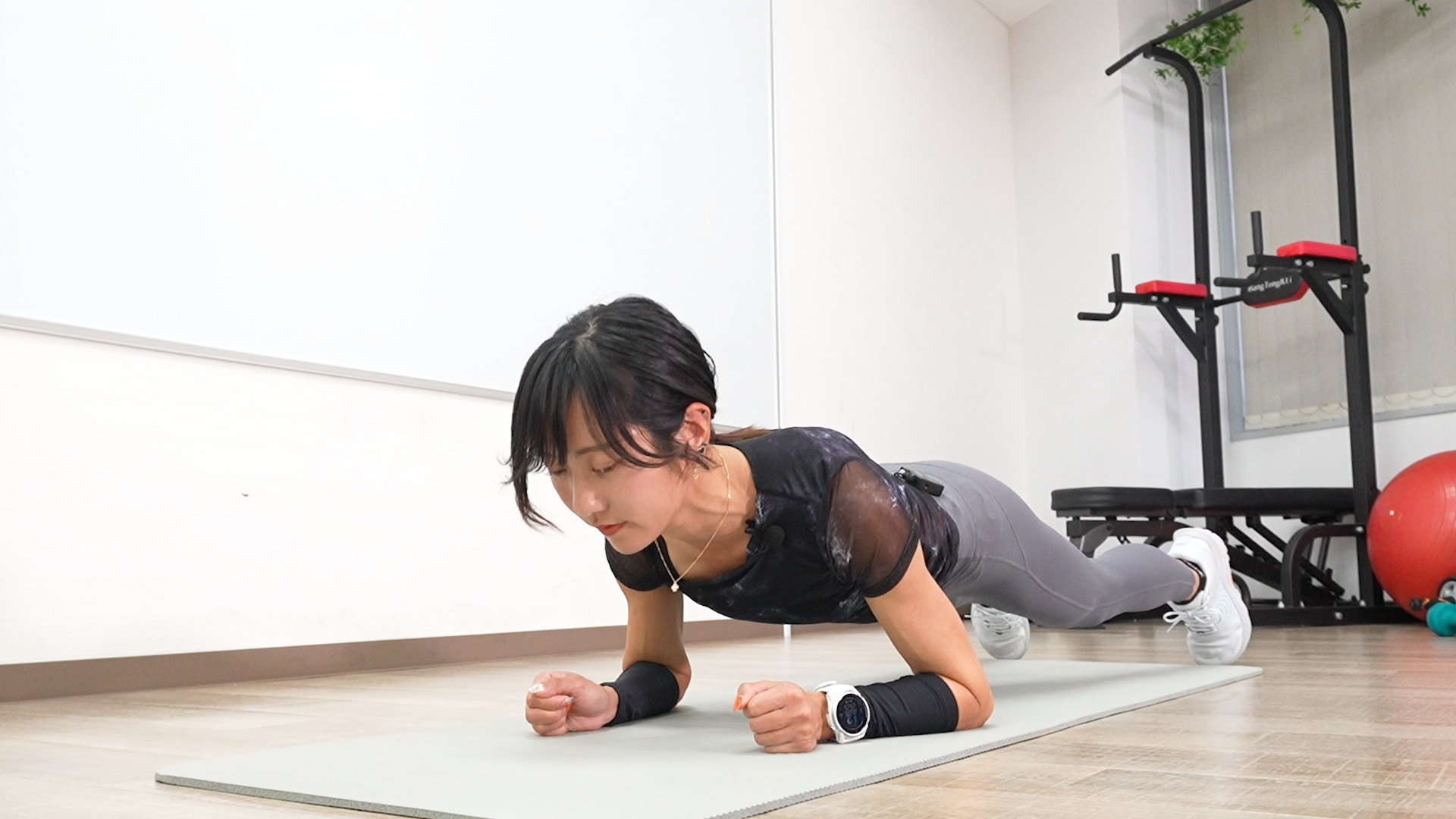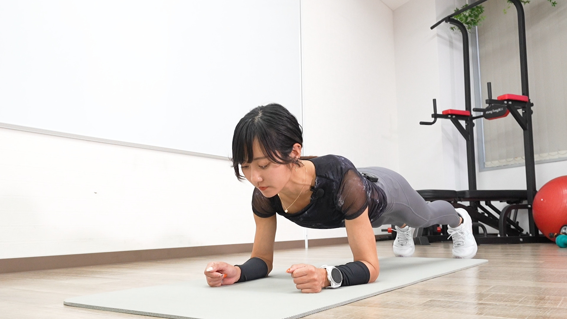 体の芯から鍛えるプランクトレーニング。腹筋に特に効くメニューです。お腹の引き締めや姿勢の改善を狙うことができます。