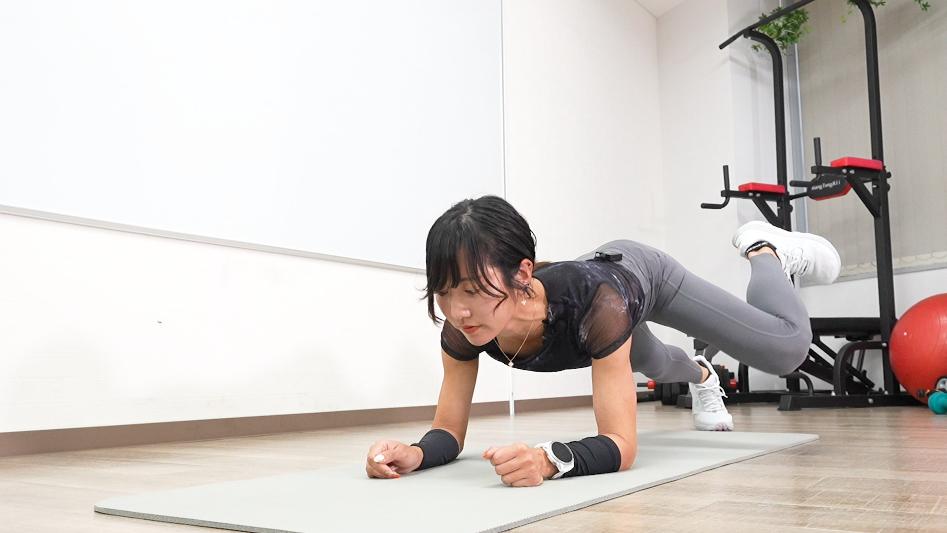 プランクの状態から、片足を上げてキープします。バランスが崩れやすいため、腹筋に力を入れてキープしていきましょう。