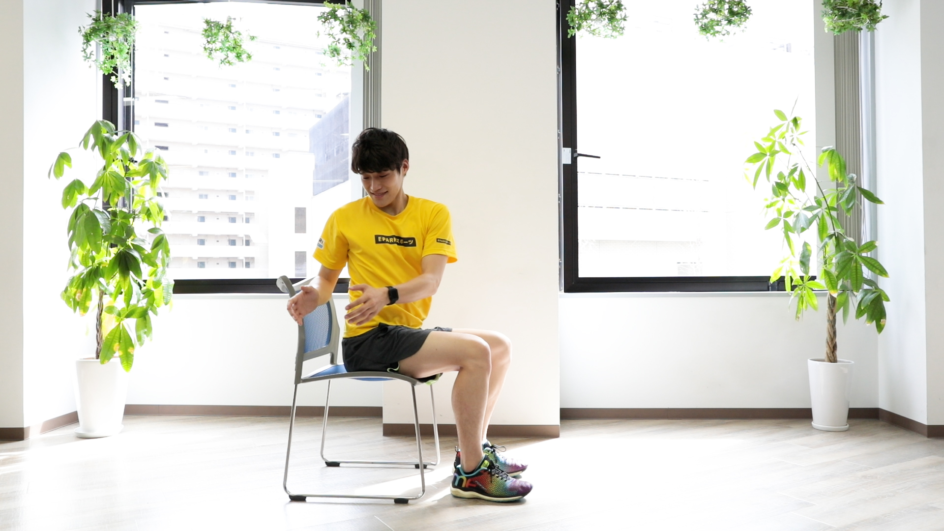 1. イスに座り、肩幅に足を開く