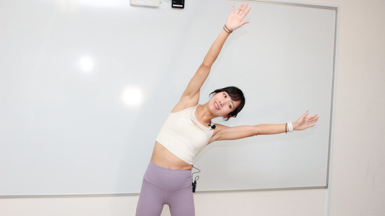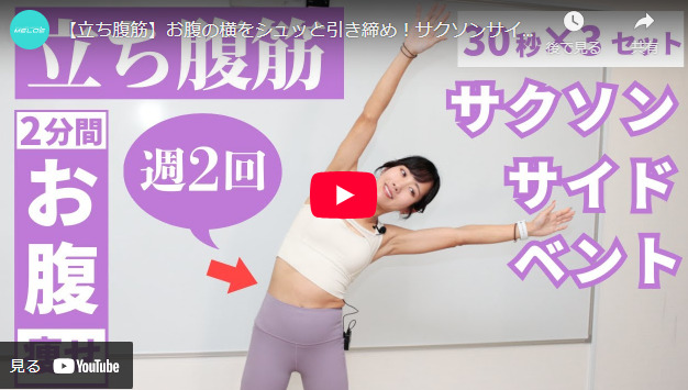 今回は「サクソンサイドベント」をご紹介。お腹の横に効かせていきます。立ったままできる立ち腹筋で、動作もシンプルなため、運動初心者も取り組みやすいメニューです。