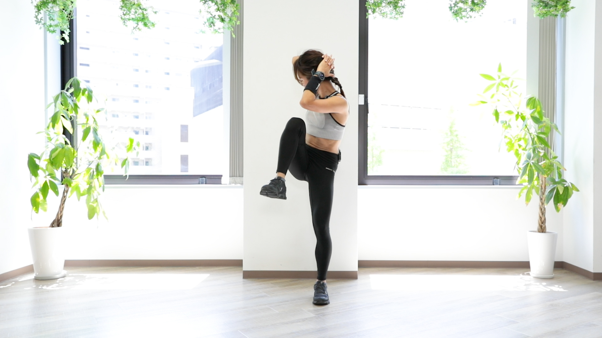 2.軽くジャンプをしながら右肘と左膝、左肘と右膝の組み合わせで、交互に引き付ける