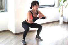 3.お尻を後ろに引きながら、太ももが床と平行になるまでしゃがむ