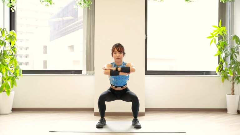7秒スクワットの特徴は、動作のスピードにあります。勢いよく回数をこなすのではなく、5秒かけて腰を落とし、2秒キープして立ち上がる流れが基本です。