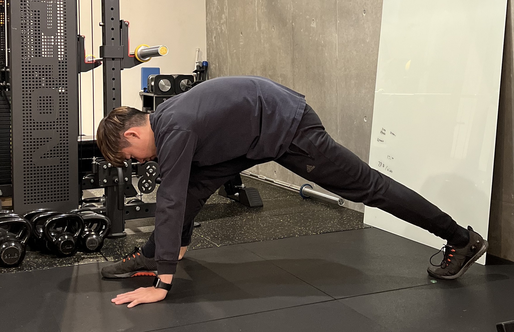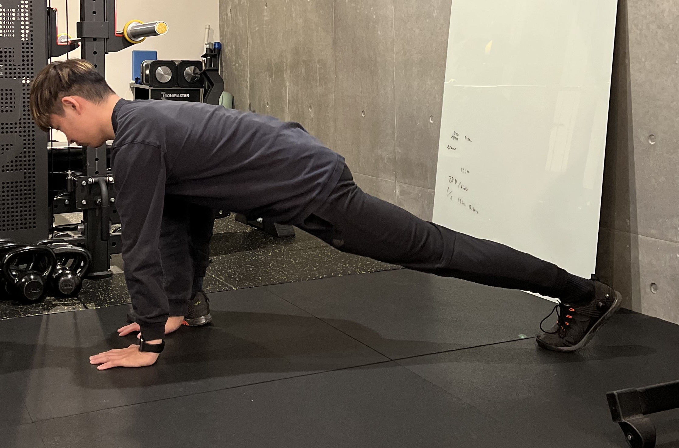 1.立った状態から、前に大きく一歩踏み出し、手を前につく