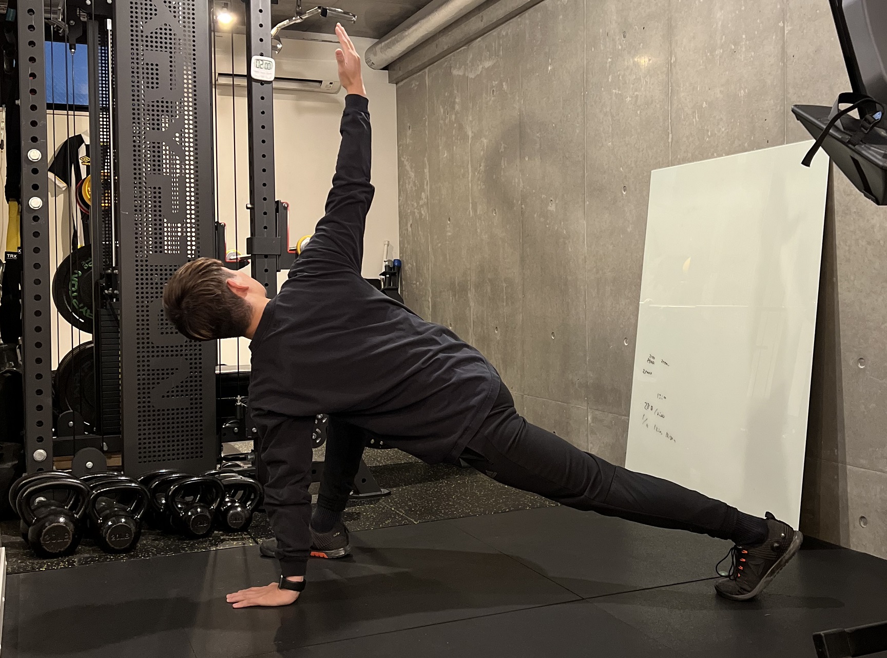 3.前に出した脚側の腕を天井に向けて回し、胸を開く