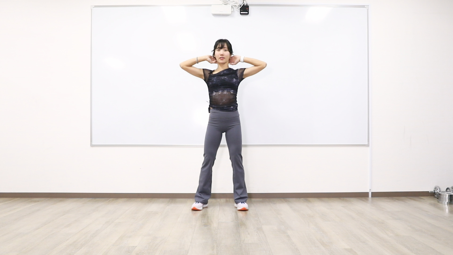 1. 肩幅に足を開き、頭の後ろで手を組む