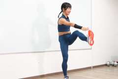 2.後方の足を振り上げて、膝と反対側の肘とをタッチさせます