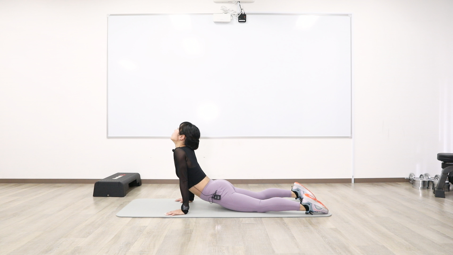 うつ伏せの状態で両腕を伸ばし、上体を押し上げます。呼吸は止めず、リラックスして行いましょう。