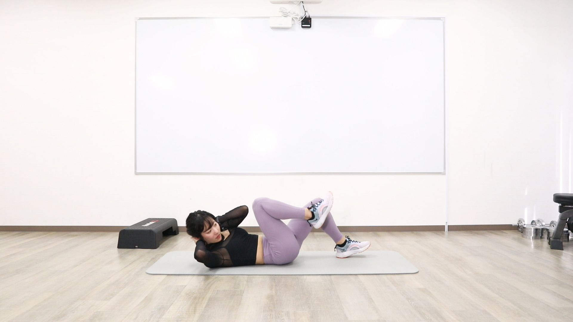 仰向けに横になり、両手を頭の後ろにセットします。両足を90度に曲げて、反対同士の肘と膝を近づけます。左右交互で進めましょう。