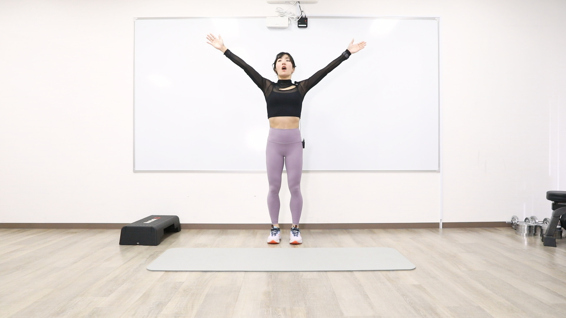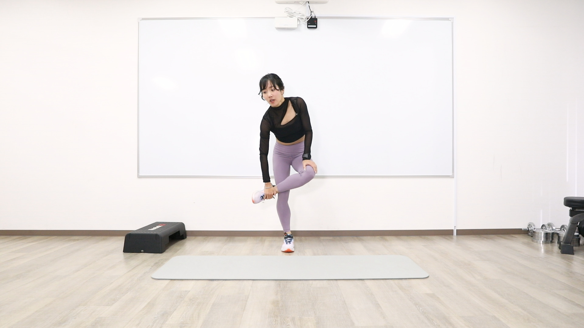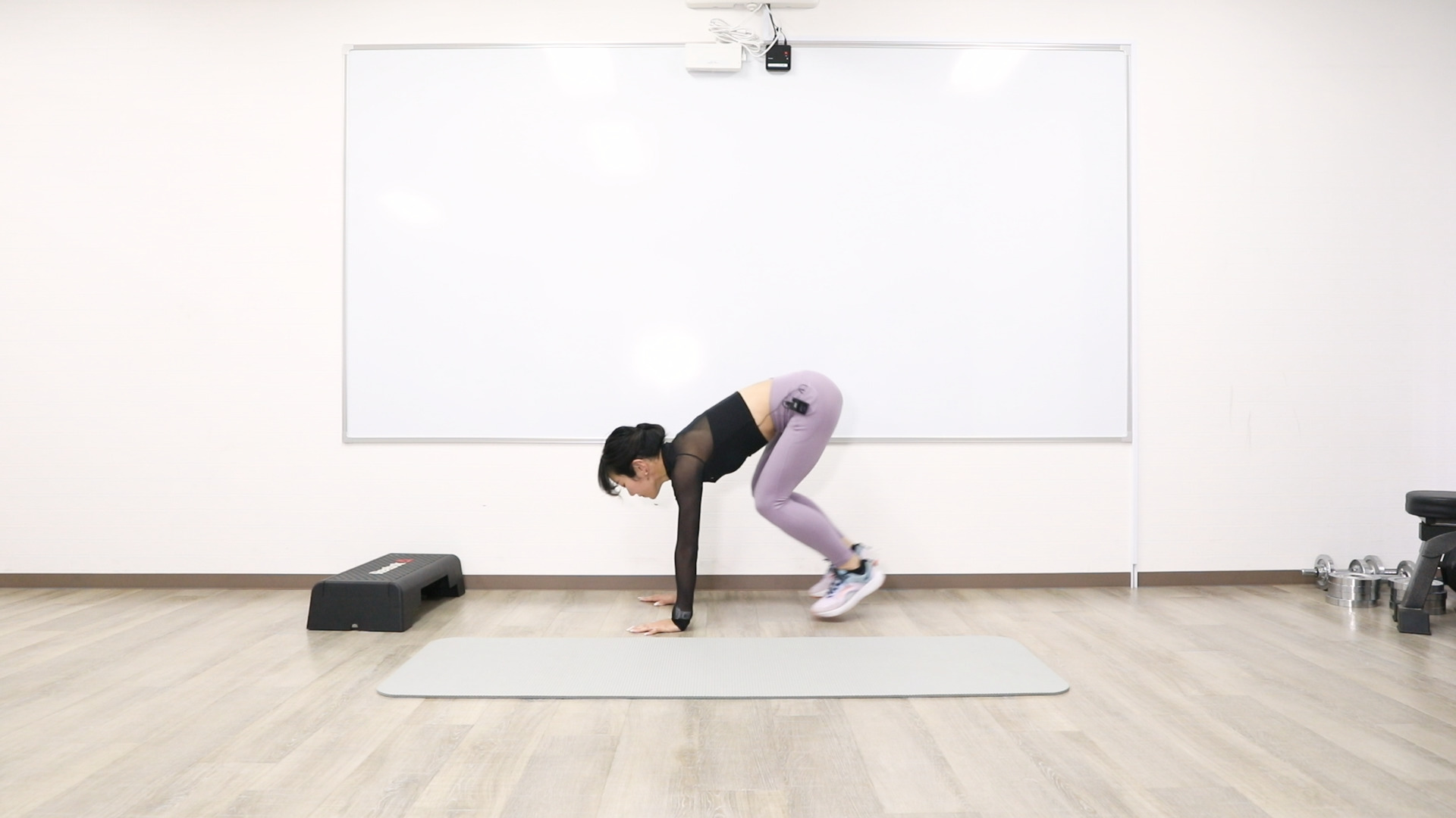 踏み台の上り下りを、スピードを上げて行います。バランスを崩さないようにしましょう。