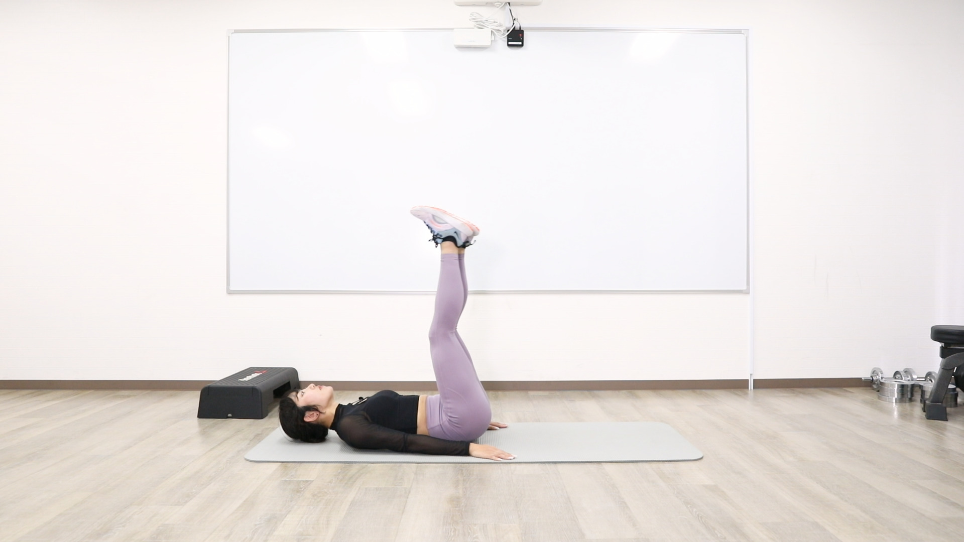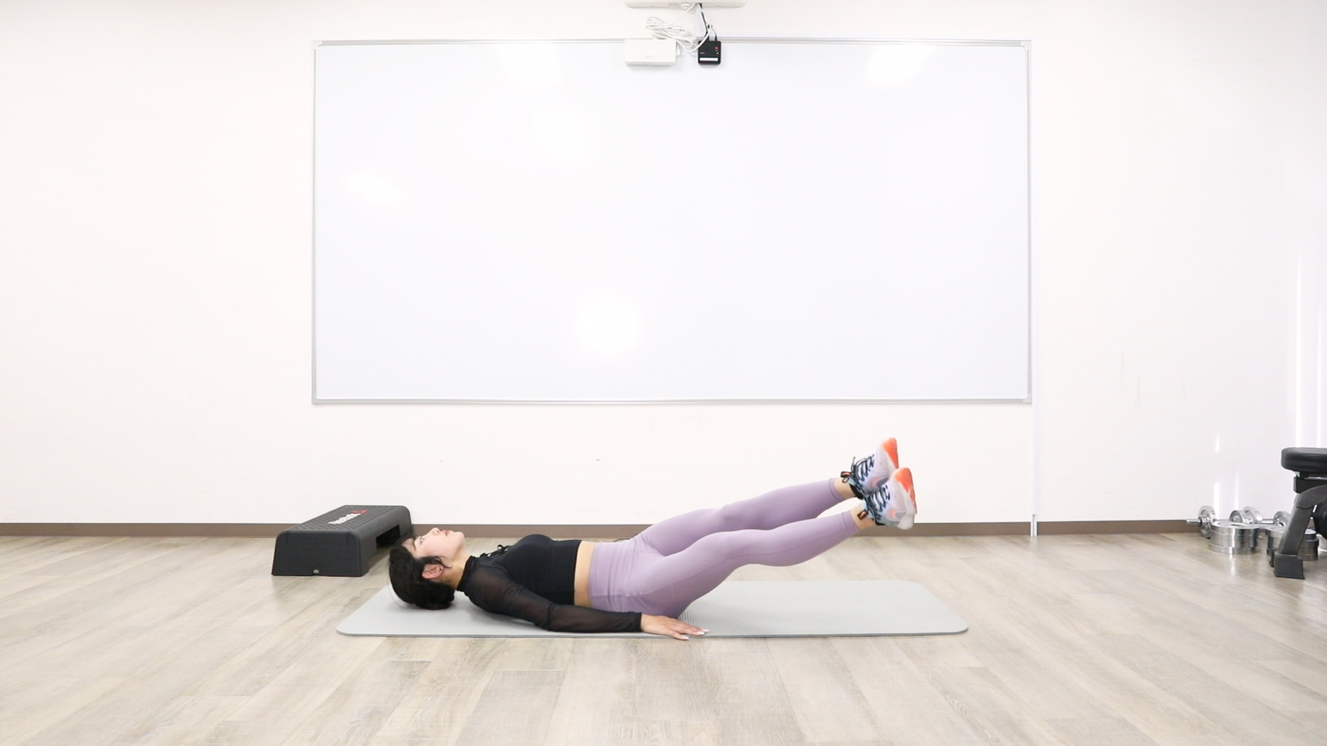 仰向けになり、かかとをくっつけて両足を浮かせます。その状態で脚の上げ下げを行いましょう。