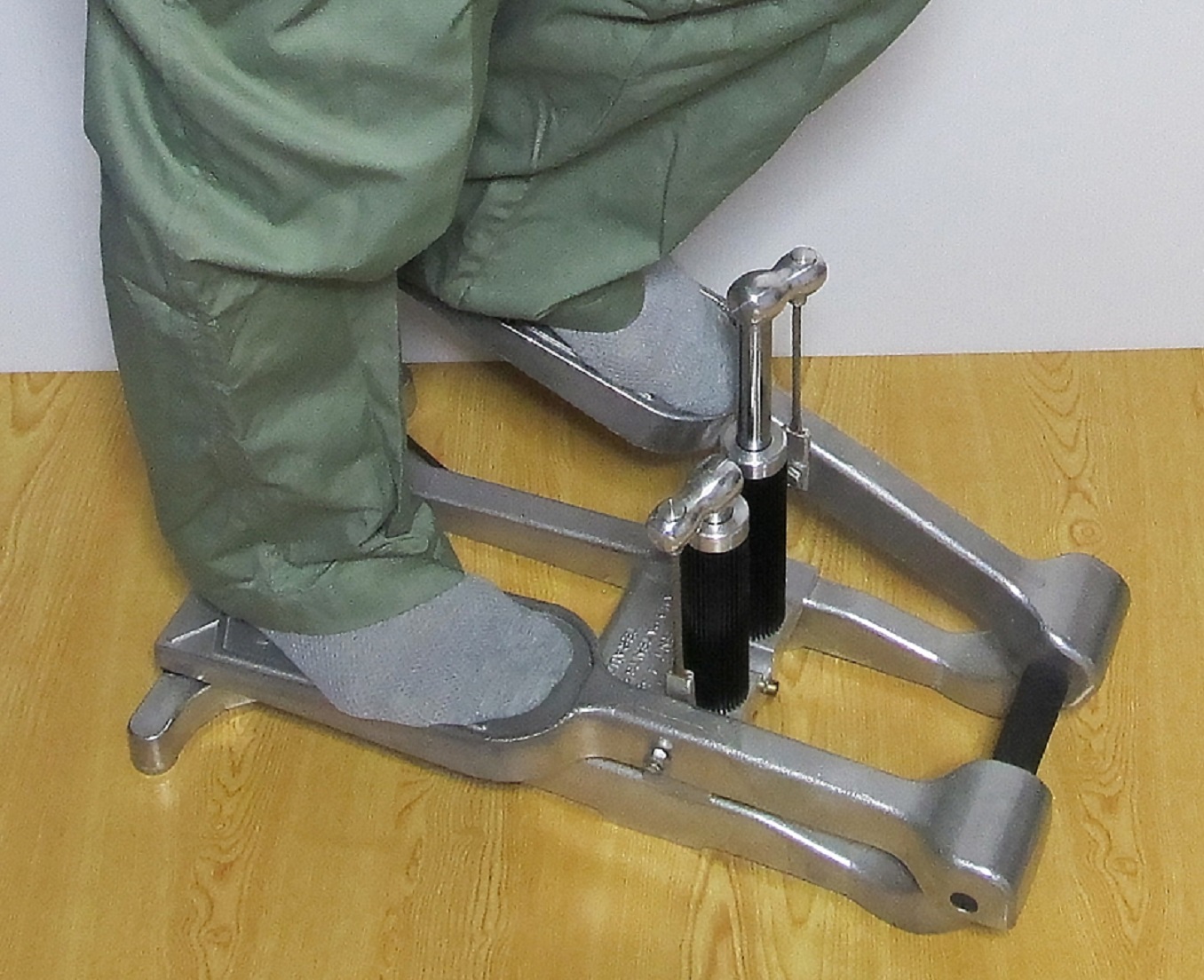背すじを伸ばして立ち、ペダル中央に足裏全体を乗せます。かかとを浮かせすぎず、一定のリズムで踏み続けることで脚全体に均等に負荷がかかります。