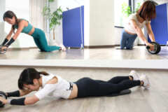 腹筋にしっかり力を入れながら行い、腰が下がってフォームが崩れないよう、注意してください。