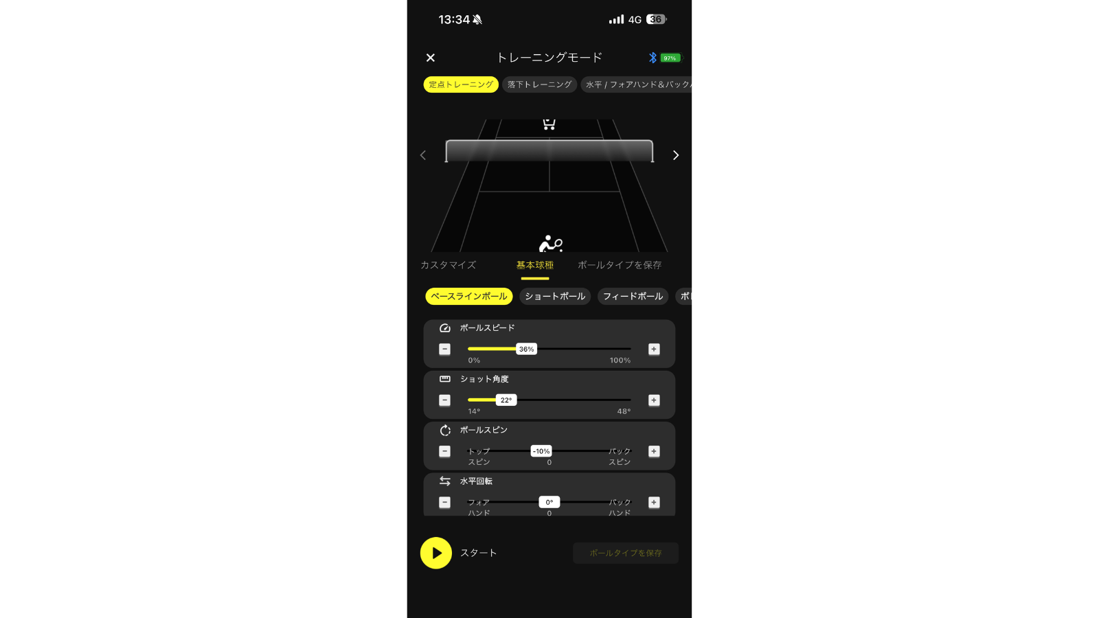 まずはトレーニングモード。本アプリのトレーニングモードでは、球出し練習の挙動を細かくカスタマイズできる設計となっている。定点トレーニングやフォア/バックの打ち分けなど、目的別のモード選択が可能である。