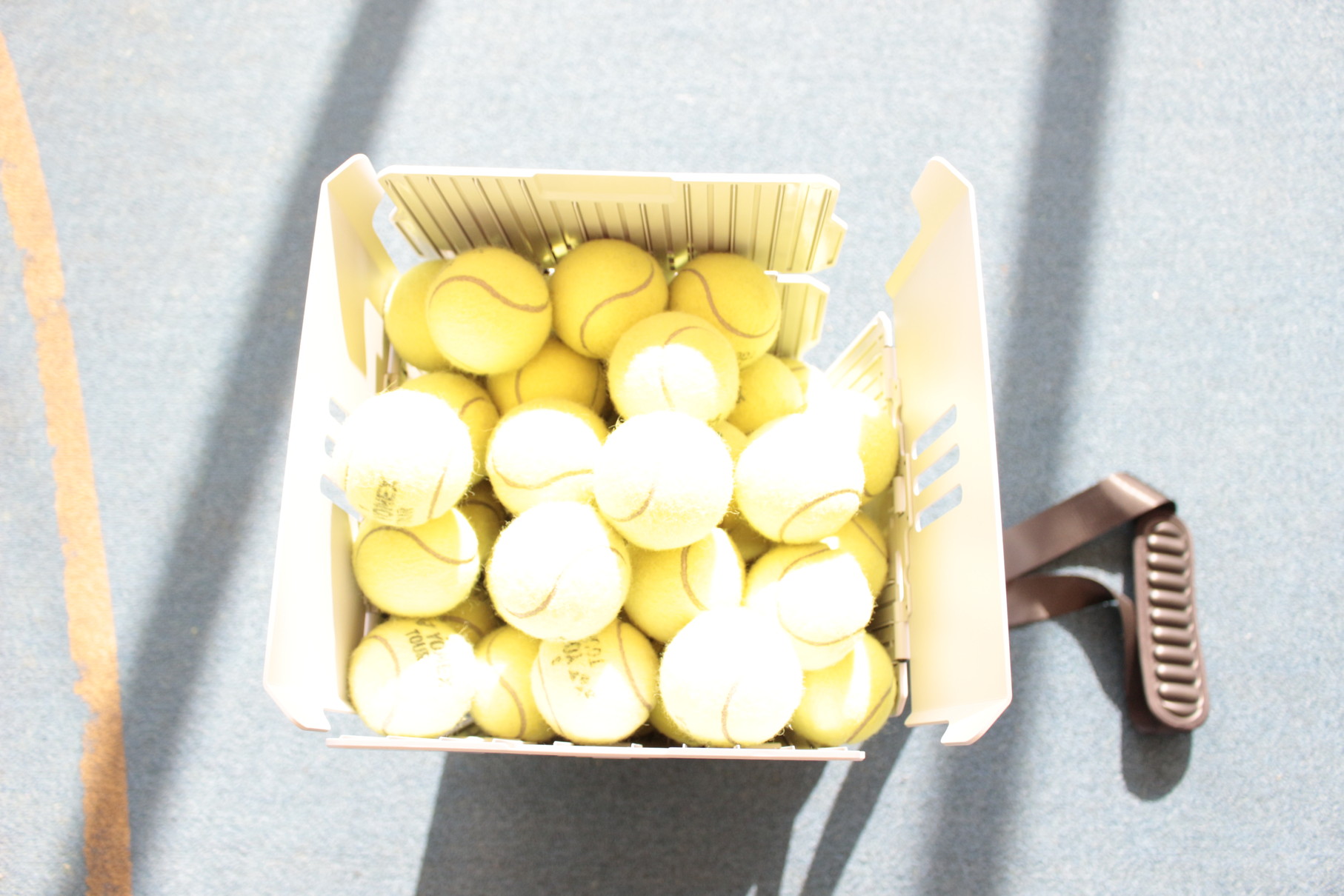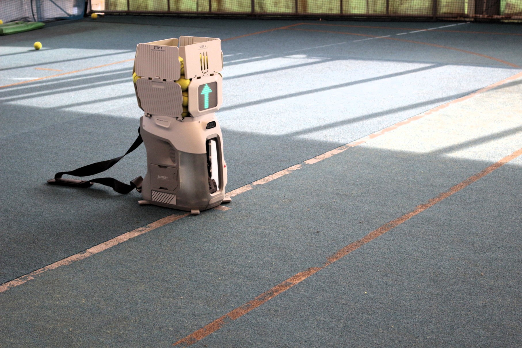 マシン自体は8.6kg(バッテリーは含まない)のため持ち運びがしやすく、 バッテリーも充電で 最大4時間稼働できる。100球以上収納で、オムニ・クレー・ハード・庭など、どのコートにも対応可だ。