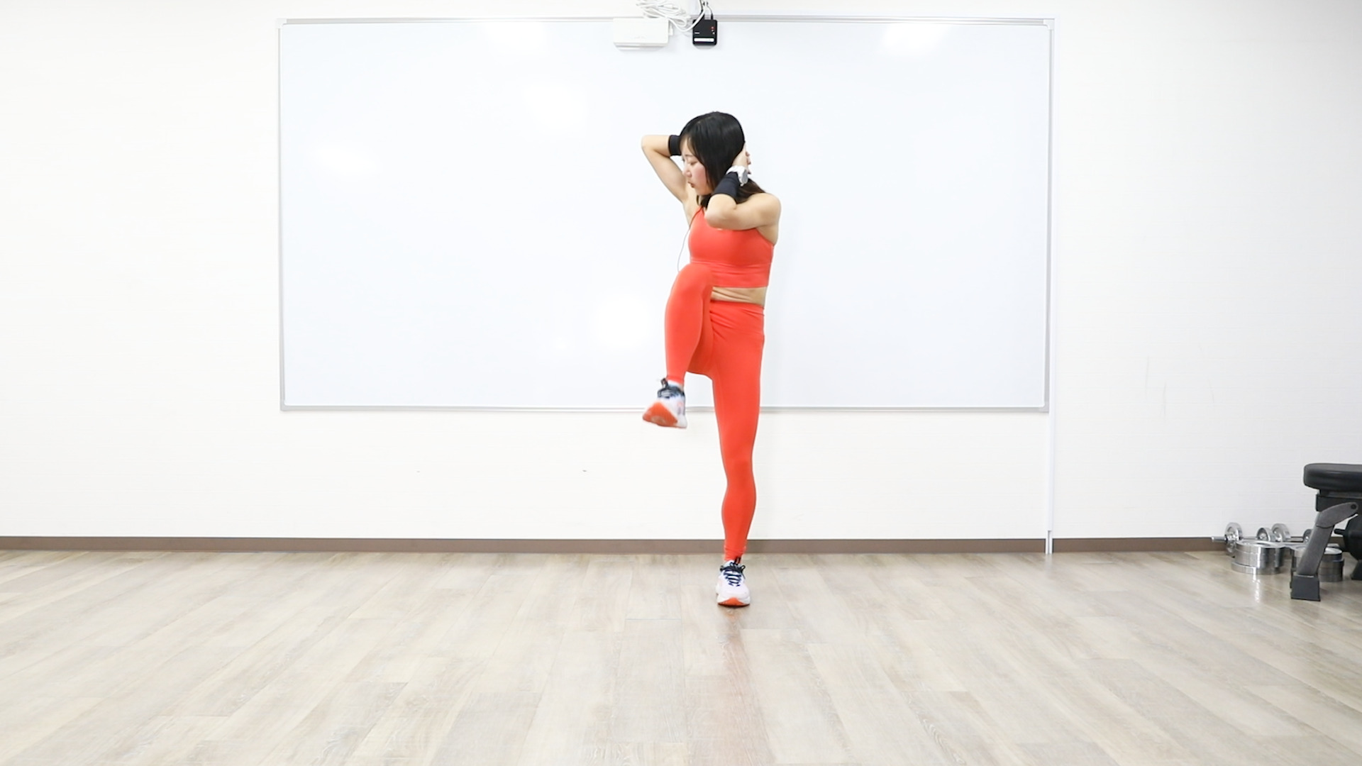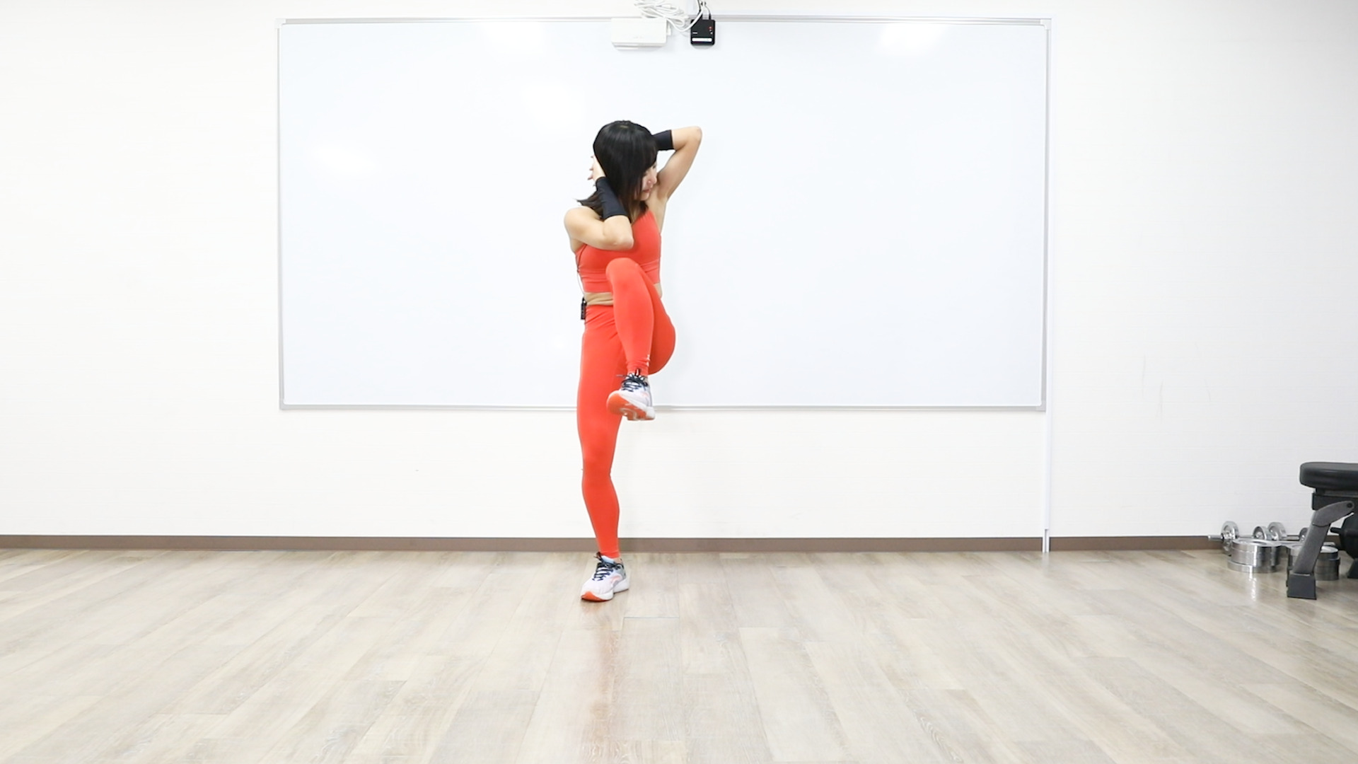 今回は立ち腹筋の「スタンディングニートゥーエルボー」。立ったままできる筋トレで比較的負荷が軽く、運動初心者も取り組みやすいメニューです。
