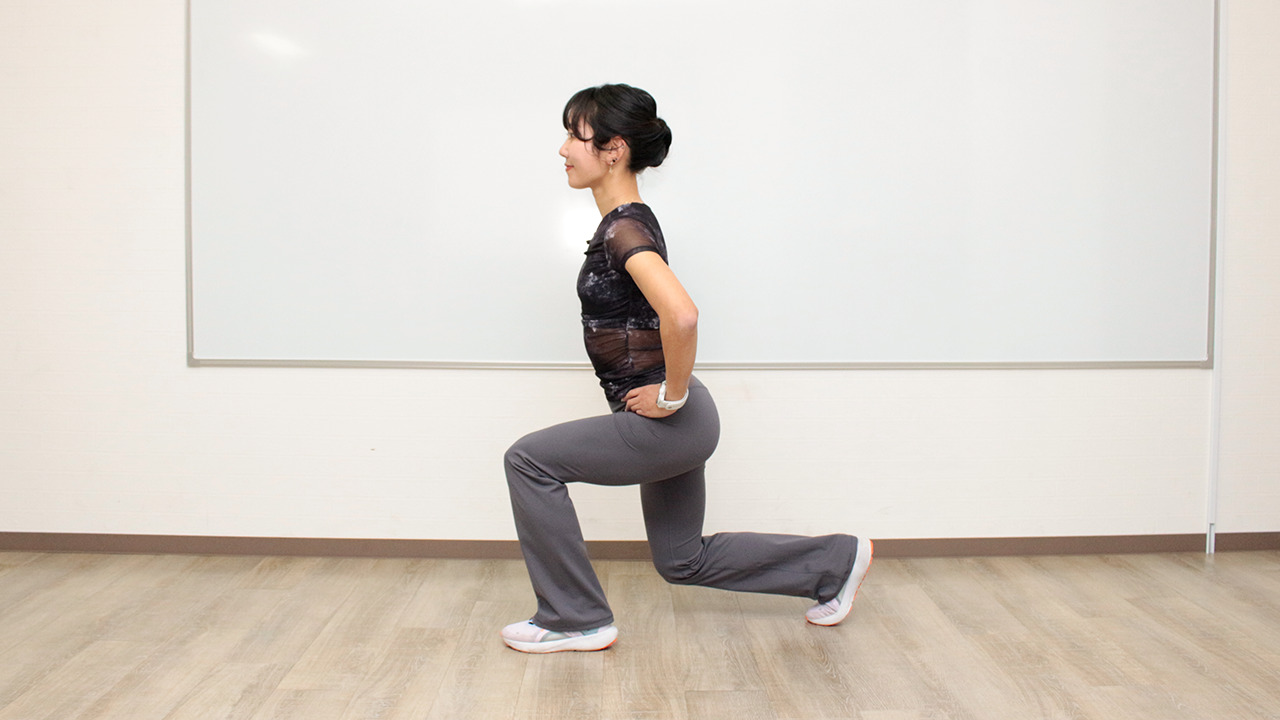 3. 前の足の膝を約90度まで曲げたら、ゆっくりと元の姿勢に戻る