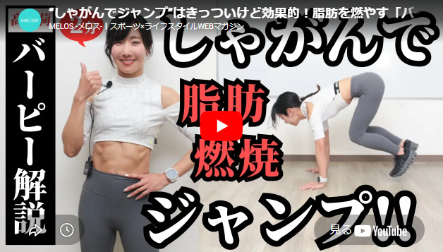 今回は、全身運動の「バーピー」を解説。脂肪燃焼効果が高く、心肺機能の向上も狙うことができます。大きな動作を心がけて、しっかり汗をかいていきましょう。