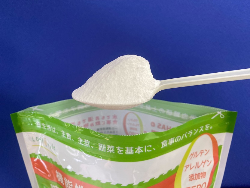 小麦粉のような白いパウダーです。無味無臭ですが、粉が細かいので開封時に少し粉が舞います。指につくとかすかにベタつきがあります。