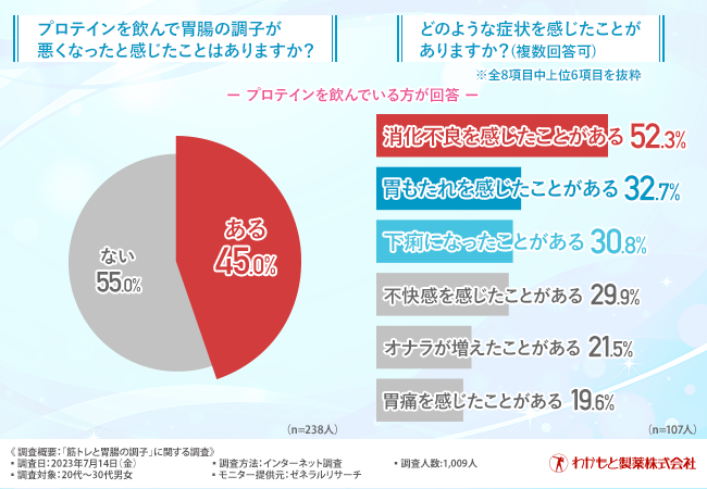 そんなプロテイン、飲むと「オナラが増えた・臭くなった」「胃腸の調子が悪くなった」という声も……。実際にどのくらいの人がこのような不調を感じているのでしょうか?