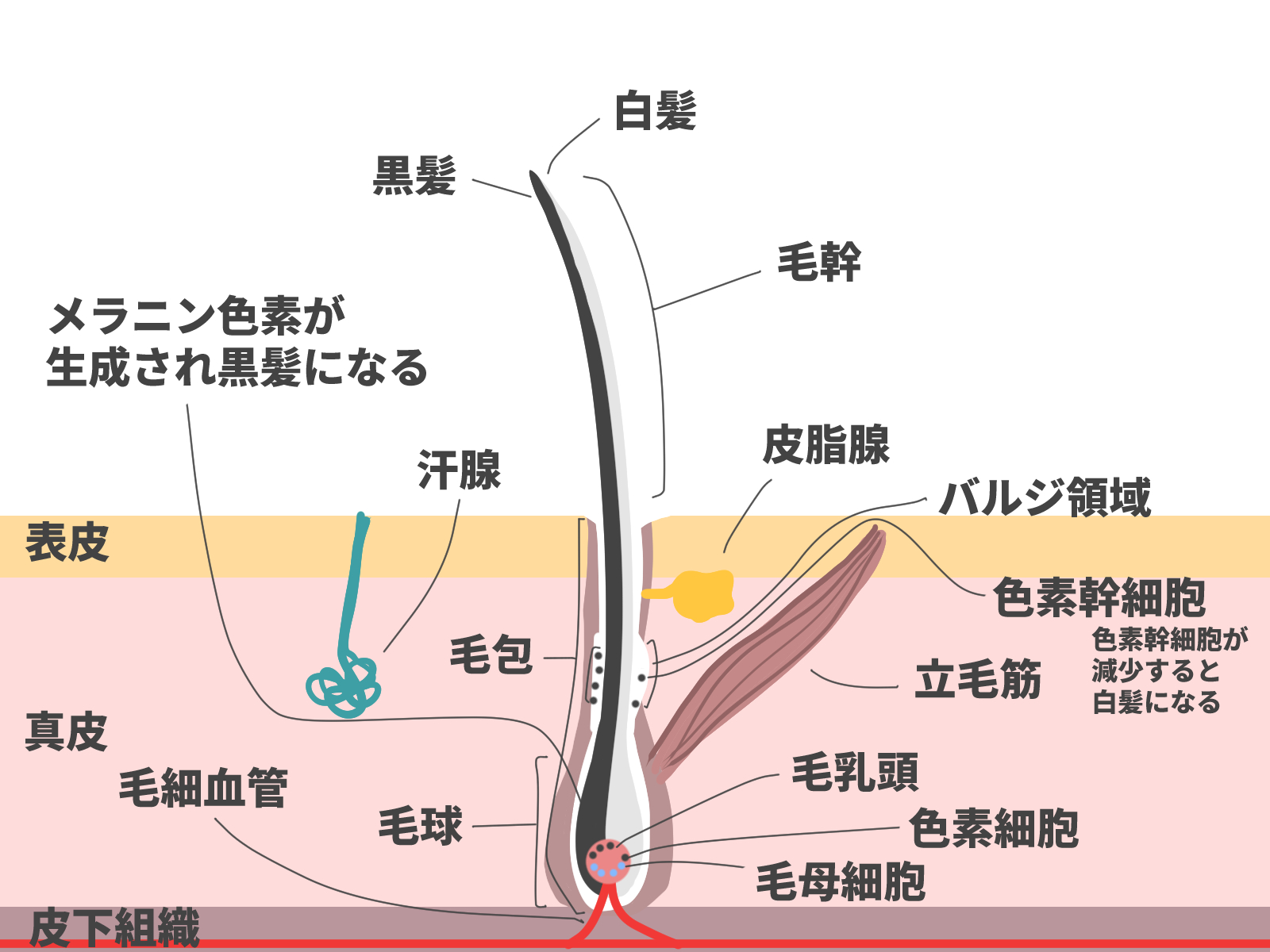強いストレスは、自律神経やホルモンバランスを乱し、毛根のメラノサイト(髪の色素を作る細胞)の働きを一時的にストップさせます。ストレス要因が解消されると、メラノサイトの機能が回復し、再びメラニンが作られて黒髪として生えてくることがあります。