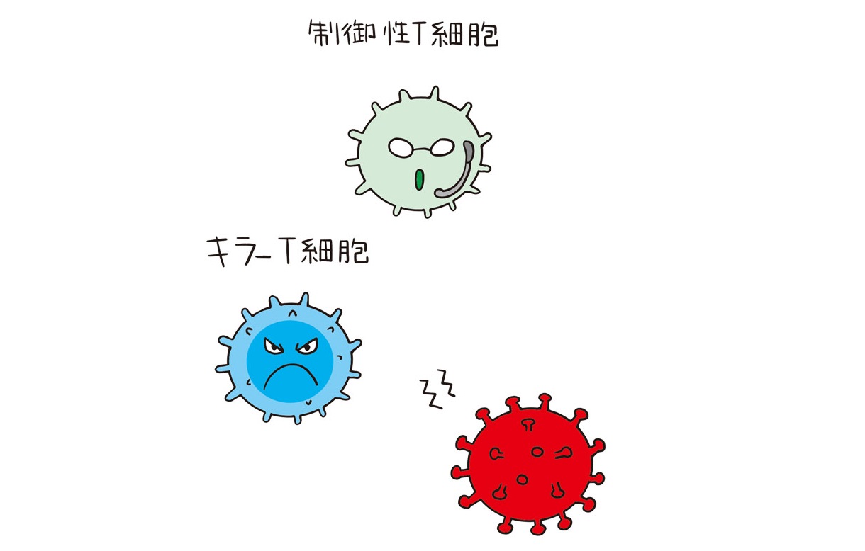 そこで登場するのが「制御性T細胞」。この細胞は免疫システムの「ブレーキ役」として、暴走したキラーT細胞を抑制します。